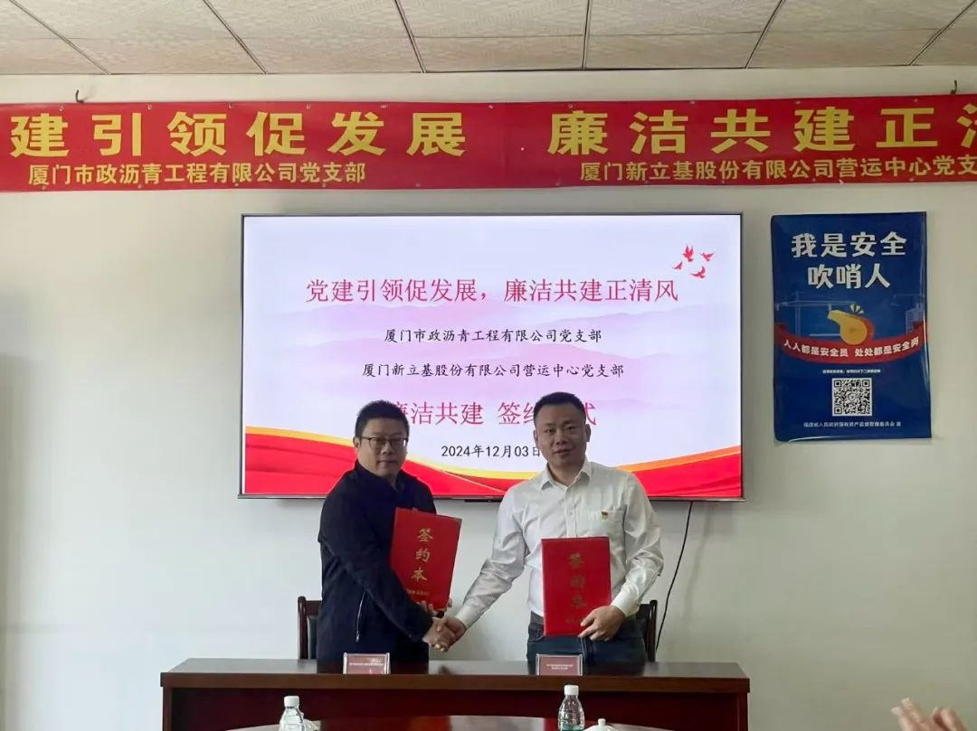 为深入学习贯彻习近平总书记在福建考察时的重要讲话和党的二十届三中全会精神,紧紧围绕“党建促业务、业务强党建”理念,系统推动党建与业务的深度融合。日前,古天乐太阳集团城营运中心党支部同厦门市政沥青公司党支部开展了“党建引领促发展 廉洁共建正清风”党建共建活动。新立基营运中心党支部书记、福建大区负责人吴建峰,厦门市政沥青公司党支部书记、董事长钟磊出席会议并签署共建协议。