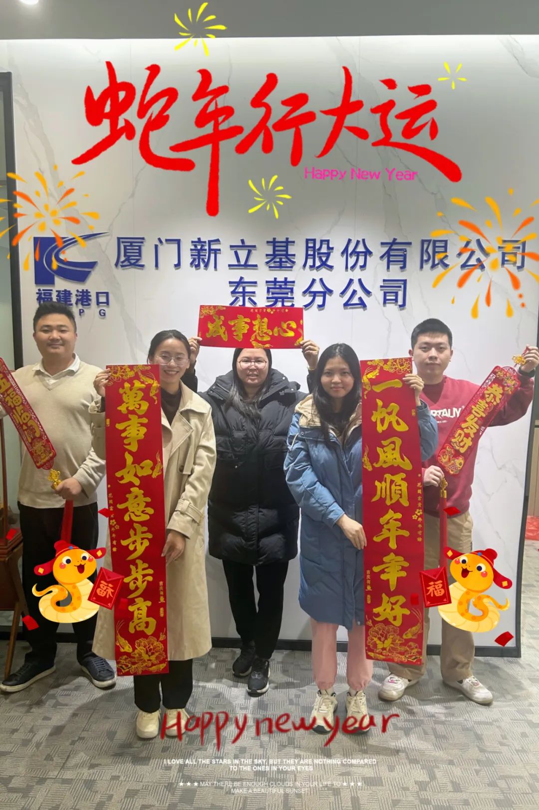 蛇年新春之际,混合料事业部(漳州新立基安溪分公司)向每一位同仁致以最诚挚的祝福!愿大家新的一年里身体健康,工作顺利,家庭幸福!祝公司业绩蒸蒸日上,市场影响力日益强大!最后祝大家新春快乐,蛇年大吉!