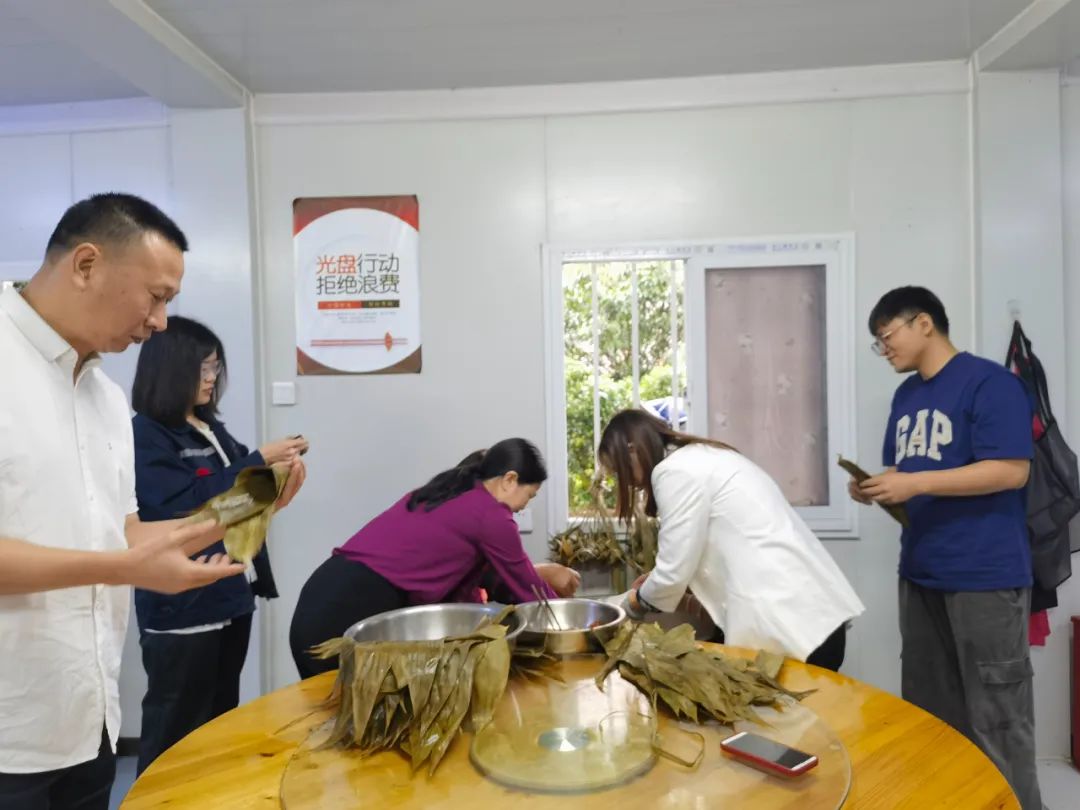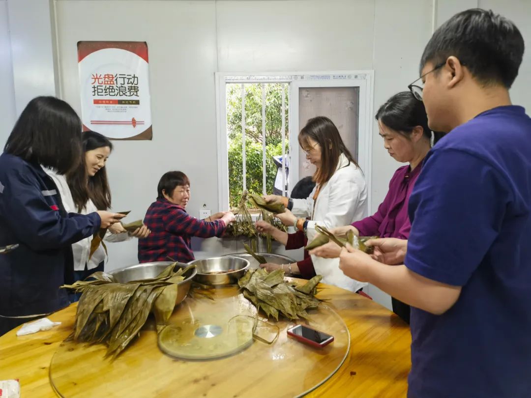 大家在食堂参与包粽子活动,食堂里艾草香气四溢,芬芳扑鼻,令人心旷神怡。大家围坐在一起,共同制作粽子。虽然技巧不够娴熟,但是参与活动的热情却让大家迫不及待一展身手,大家互相学习互相教学,欢声笑语不断,在感受浓浓节日气氛的同时,也展现出同事间和谐融洽、互助向上的风采。