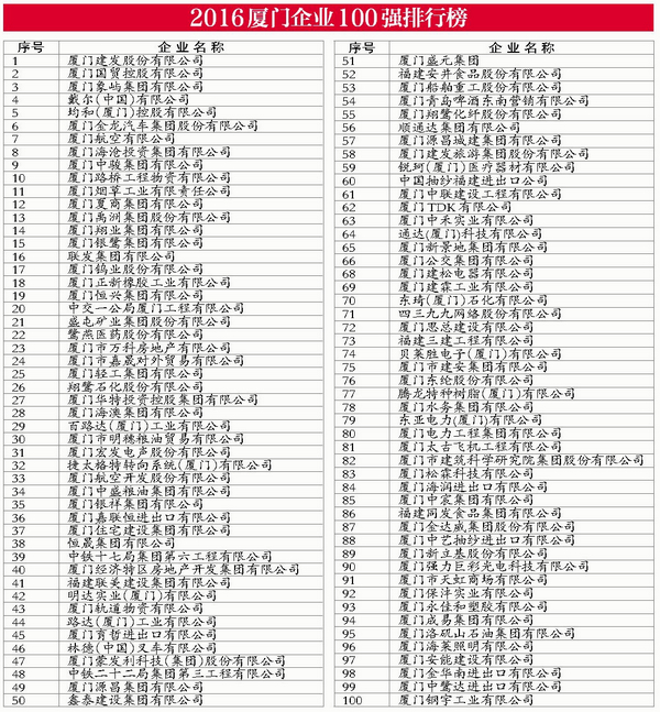 近日,厦门企业和企业家联合会、厦门日报社、厦门广电集团联合主办,各行业协会协办的“2016厦门企业100强”排序活动圆满落幕,我司继2015年后再度跻身“厦门企业100强”排行榜,位居“2016厦门企业100强”的第89位!