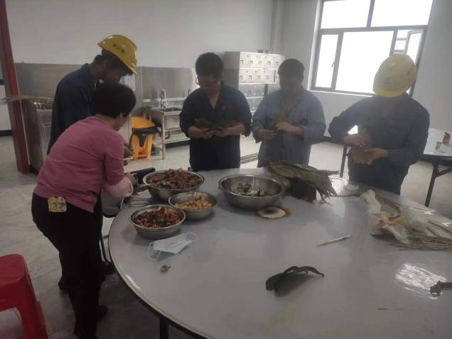 一大早,食堂阿姨把提前泡好的糯米、竹叶、板栗、虾仁等材料整齐地摆放在桌子上。活动正式开始后,大家围在一起,纷纷使出看家本领。捋粽叶、做漏斗状、填糯米、压紧实、封口、扎捆,巧手翻飞,不一会儿功夫,长条形的漂亮粽子瞬间成型。大家一边包粽子,一边唠家常,一片融洽和谐。包粽子结束后,食堂阿姨把大家包好的粽子现场煮熟,热气腾腾的粽子上桌后,大家品尝着自己亲手包的粽子都赞不绝口。