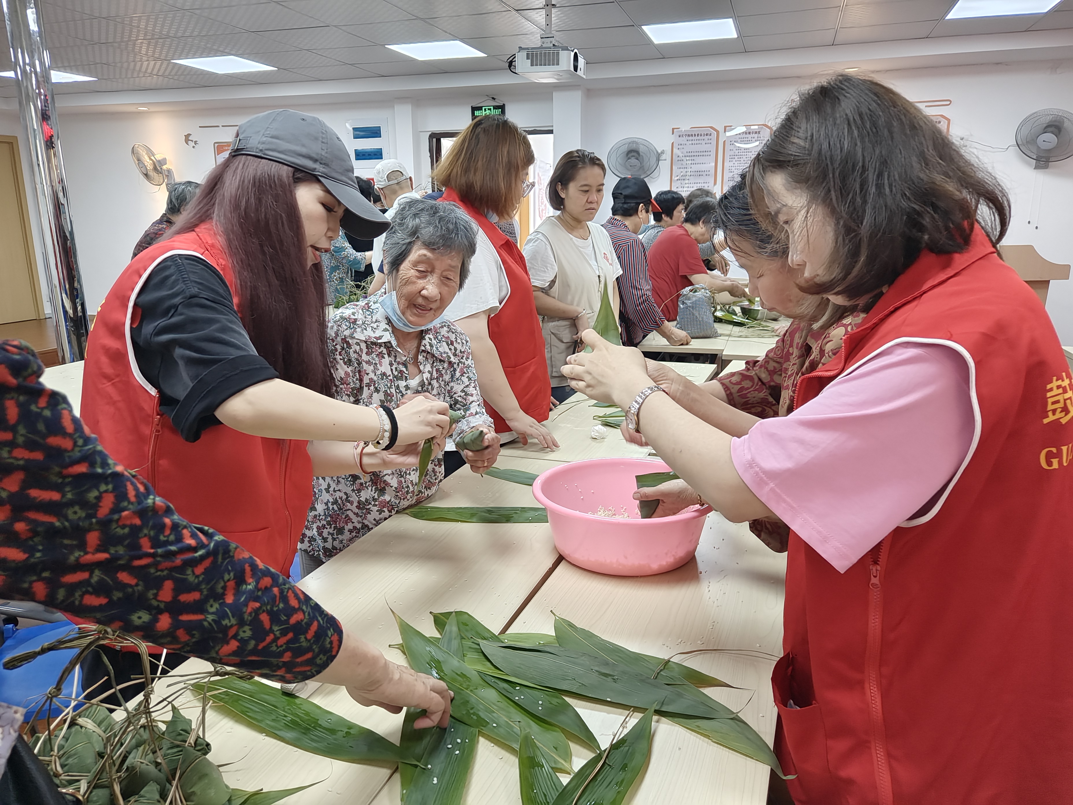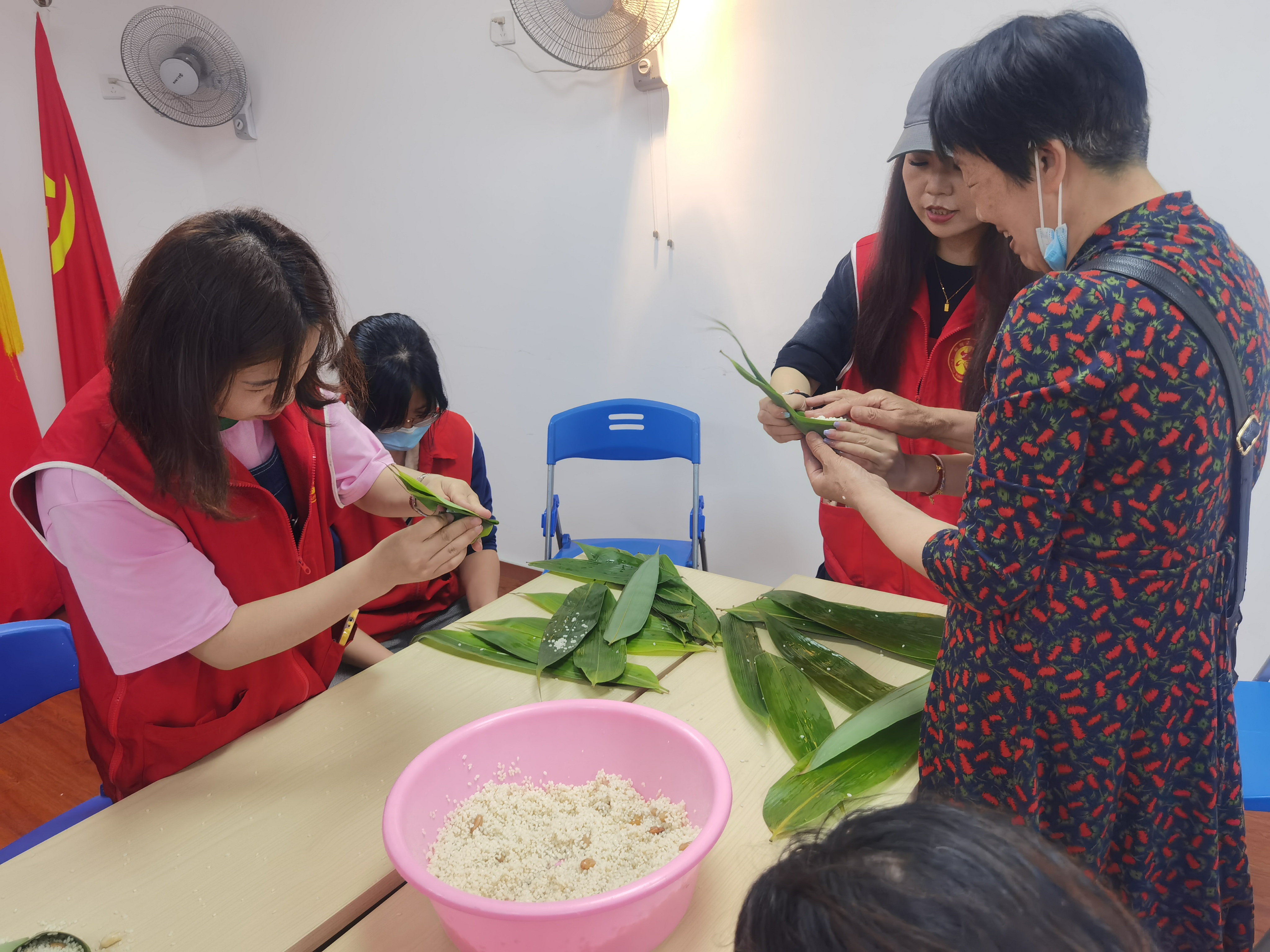 公司组织员工参加东湖社区开展的包粽子活动,活动现场,桌子上摆放着糯米、花生、粽叶等原材料,社区居民们都是包粽子的一把好手,手把手现场教学,在“师傅”的指导下,元拿粽叶、做形状、填糯米、压紧实、封口、用绳子绑好,忙的不亦乐乎,现场充满欢声笑语。最后,大家为展示这丰硕的劳动成果,一起合影留念,互赠粽子传达美好祝愿。