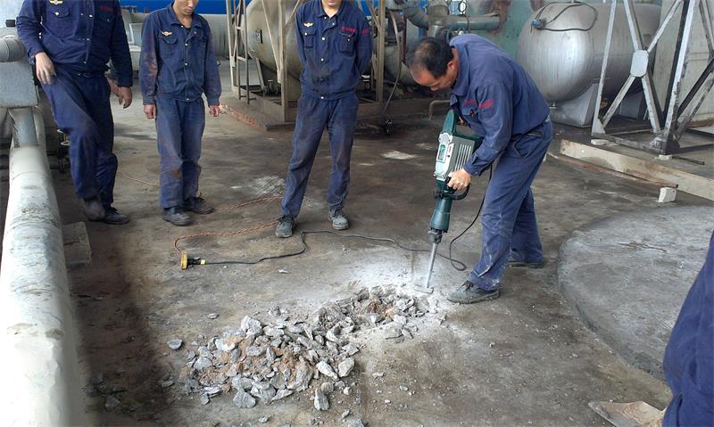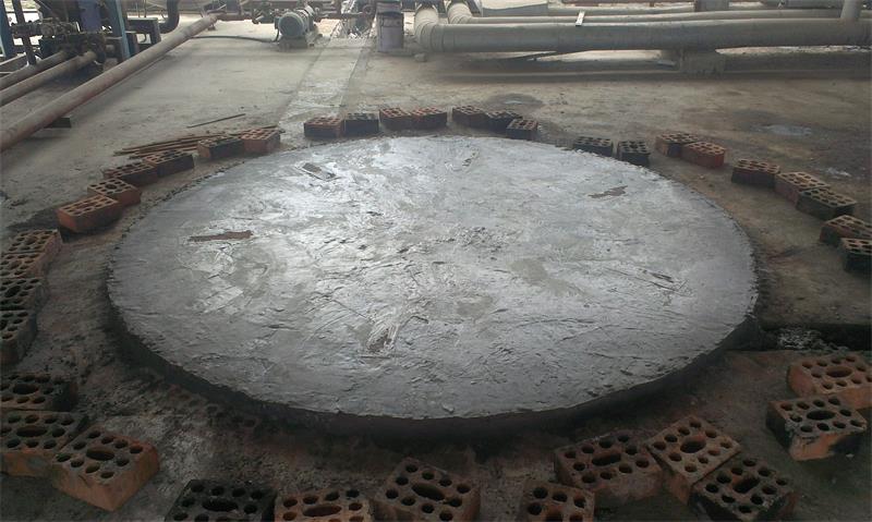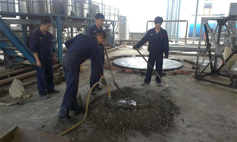 2014年2月25-27日库区生产(技术)部人员在当前没有生产发货的有利条件下,利用自身具备的知识、经验,自行打水泥板并采购水泥,拌制混凝土。大家齐心协力、团结协作、不俱辛苦共同完成预制钢筋锅炉基础一个,循环泵基座三个的制作工程。